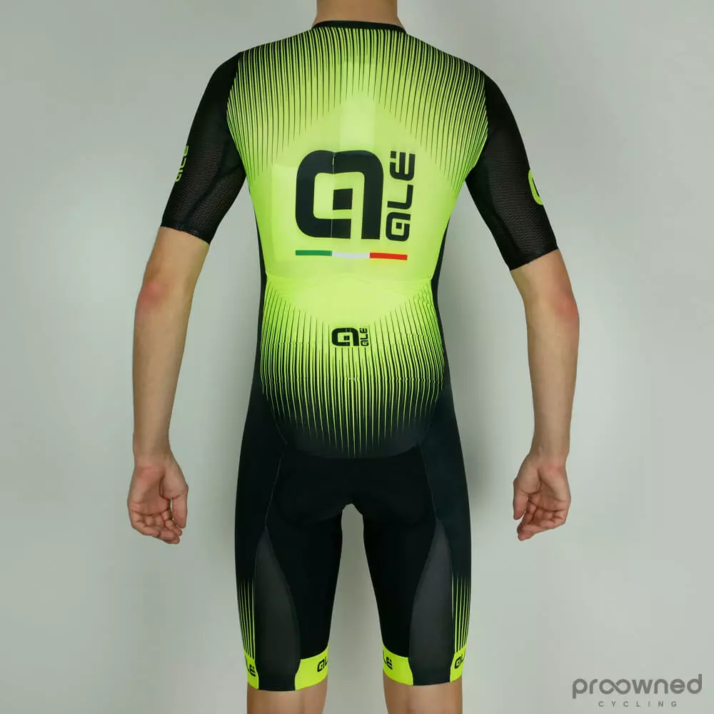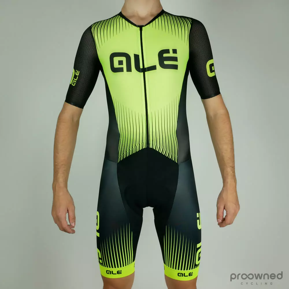 Brand new Alé short sleeve speedsuit with Alé’s Shammy 8HF top pad. The Alé PR-S line is the result of further development of the PRR line clothing. Every bit of the line has been renewed to present only the best. The PR-S line features a lightweight and fast-wicking fabric to keep you cool. The material absorbs and dissipates electrostatic charges and deliver incredible comfort at all times. Not only that, it speeds up moisture evaporation and it’s anti-bacterial, keeping you fresh and dry even as the intensity of your ride increases. The fabric is designed to fit like a second skin for the highest comfort and aerodynamics.