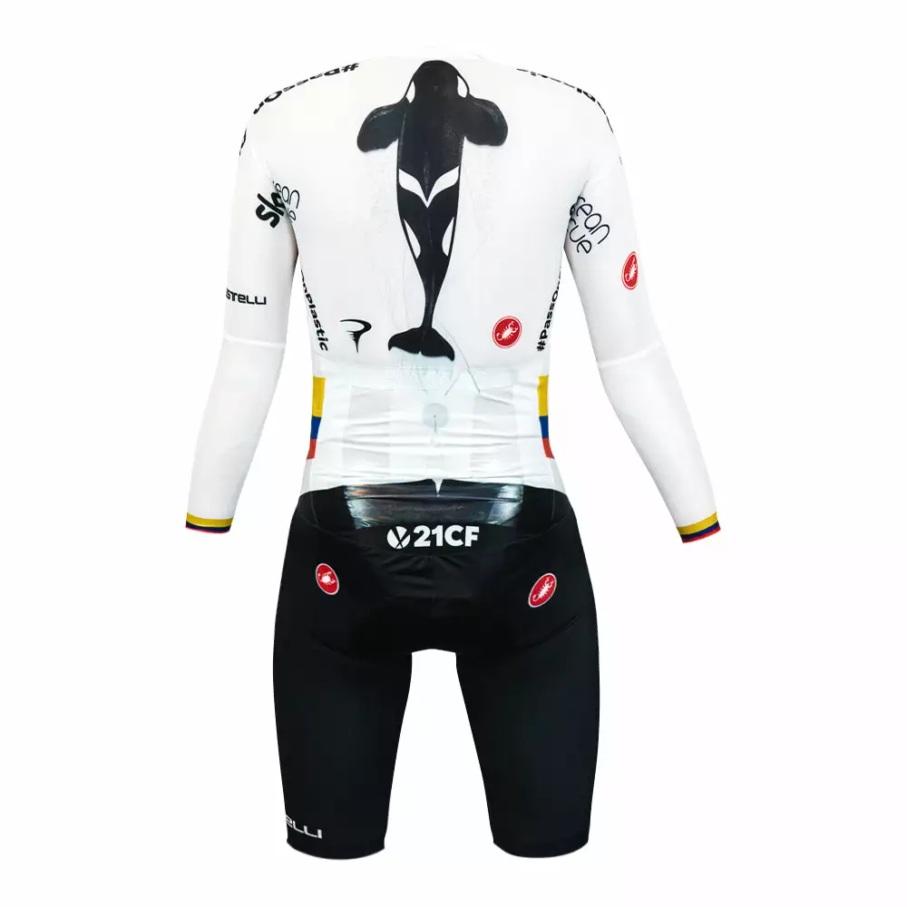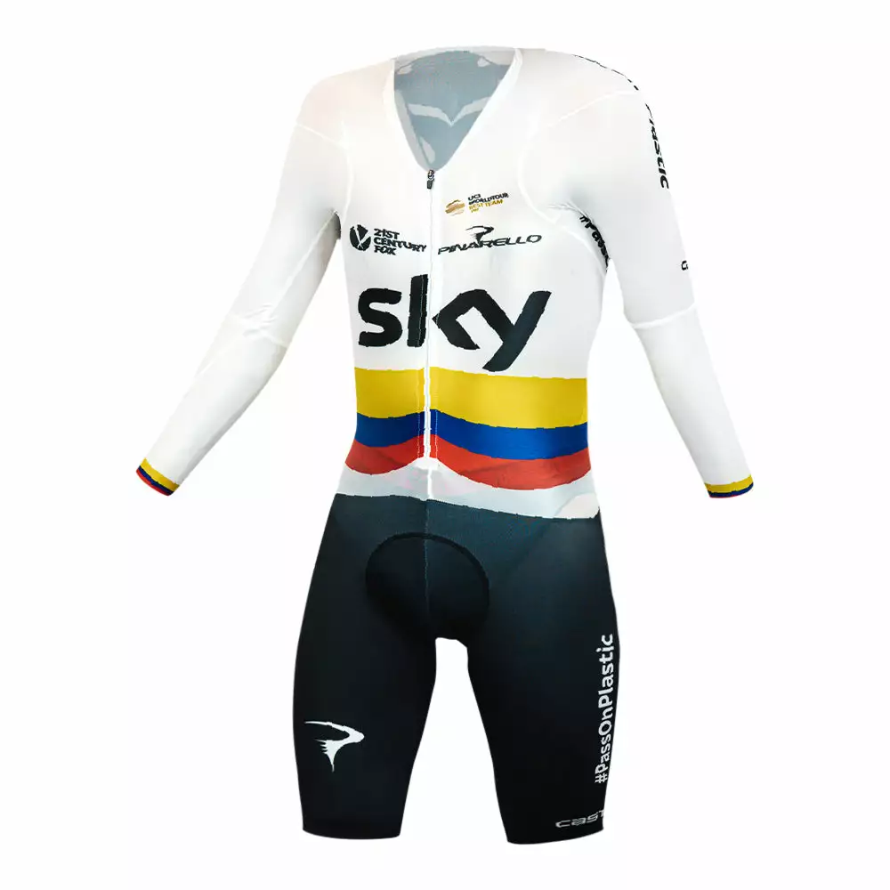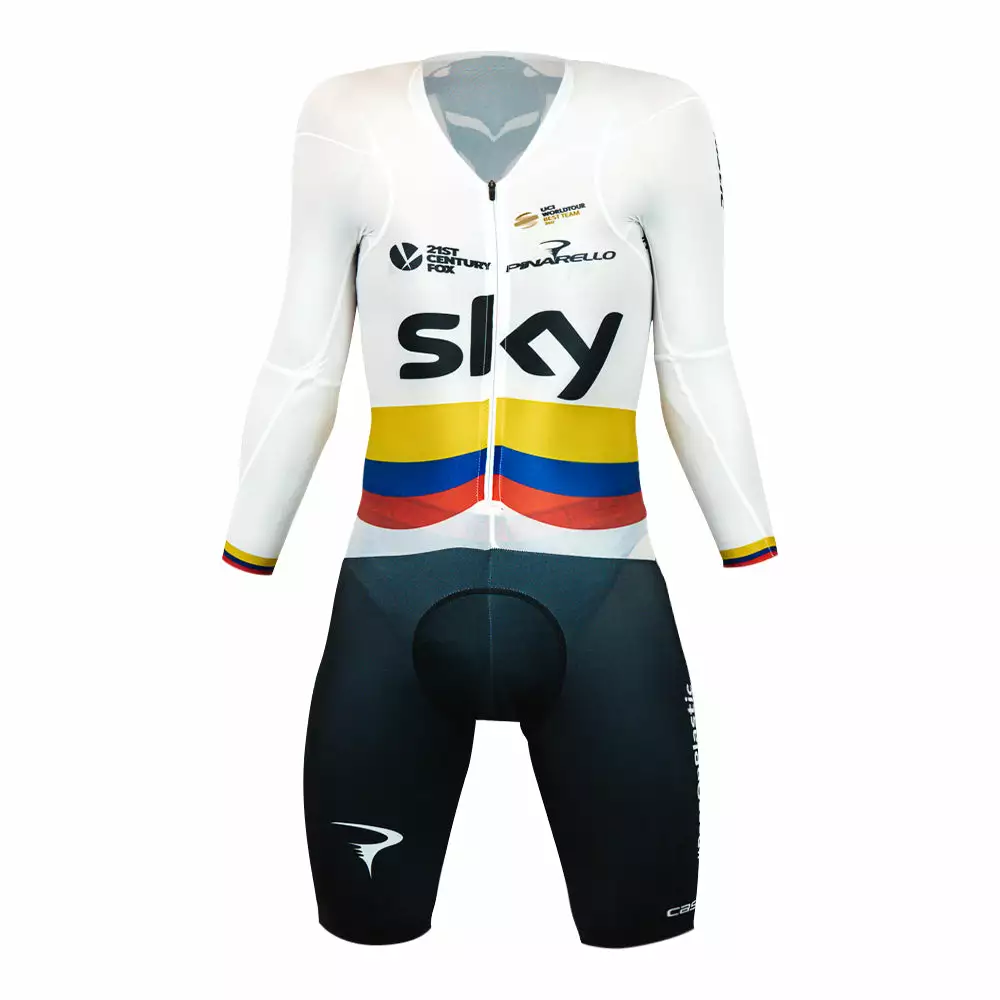 Team Sky’s new Castelli Bodypaint 4.2 Short Sleeve Columbian National Champ Speed Suit is a marvel of aerodynamics and fabric engineering. Designed for time trials, its one of the faster puzzle pieces. This is no ordinary Lycra skinsuit. Castelli spent years perfecting it.