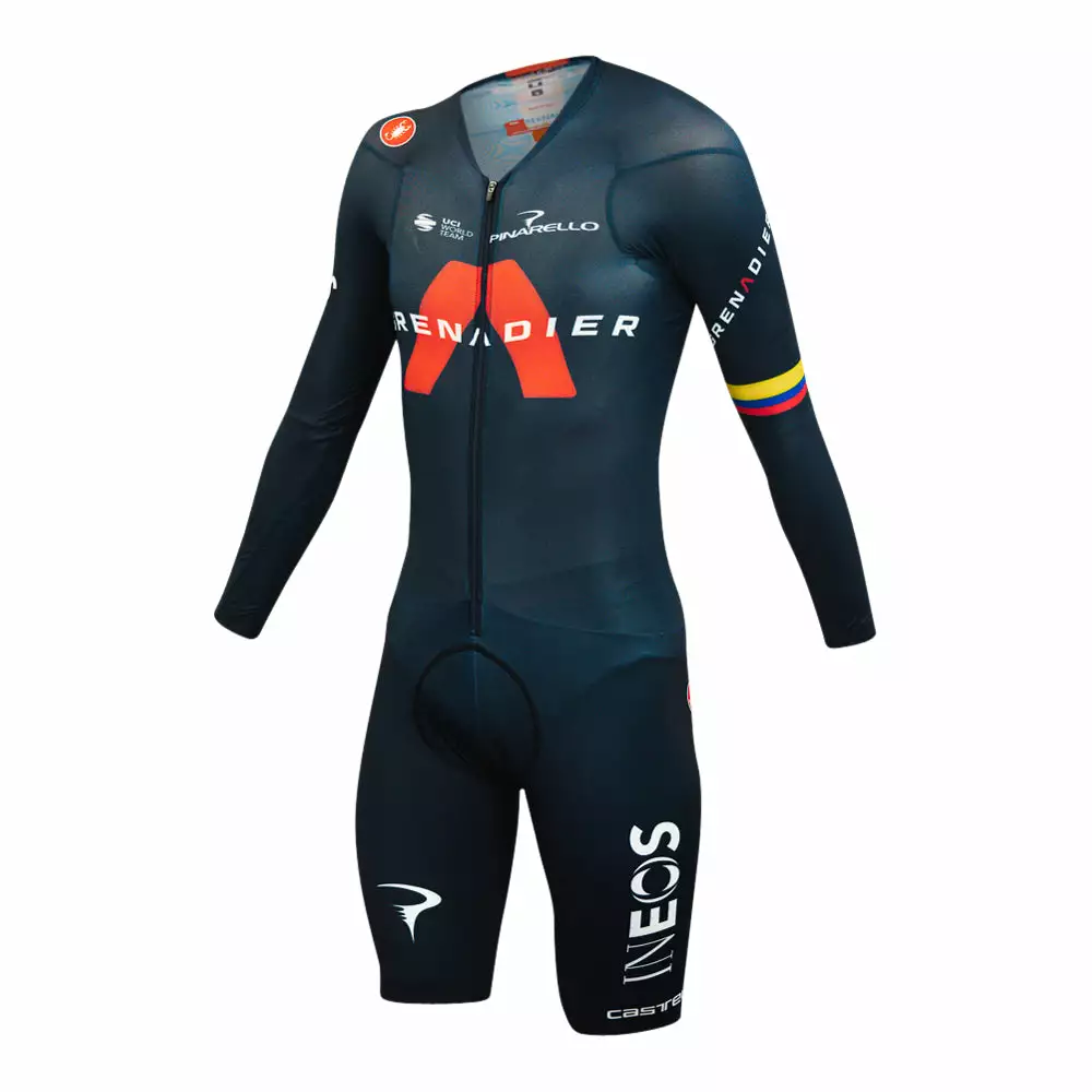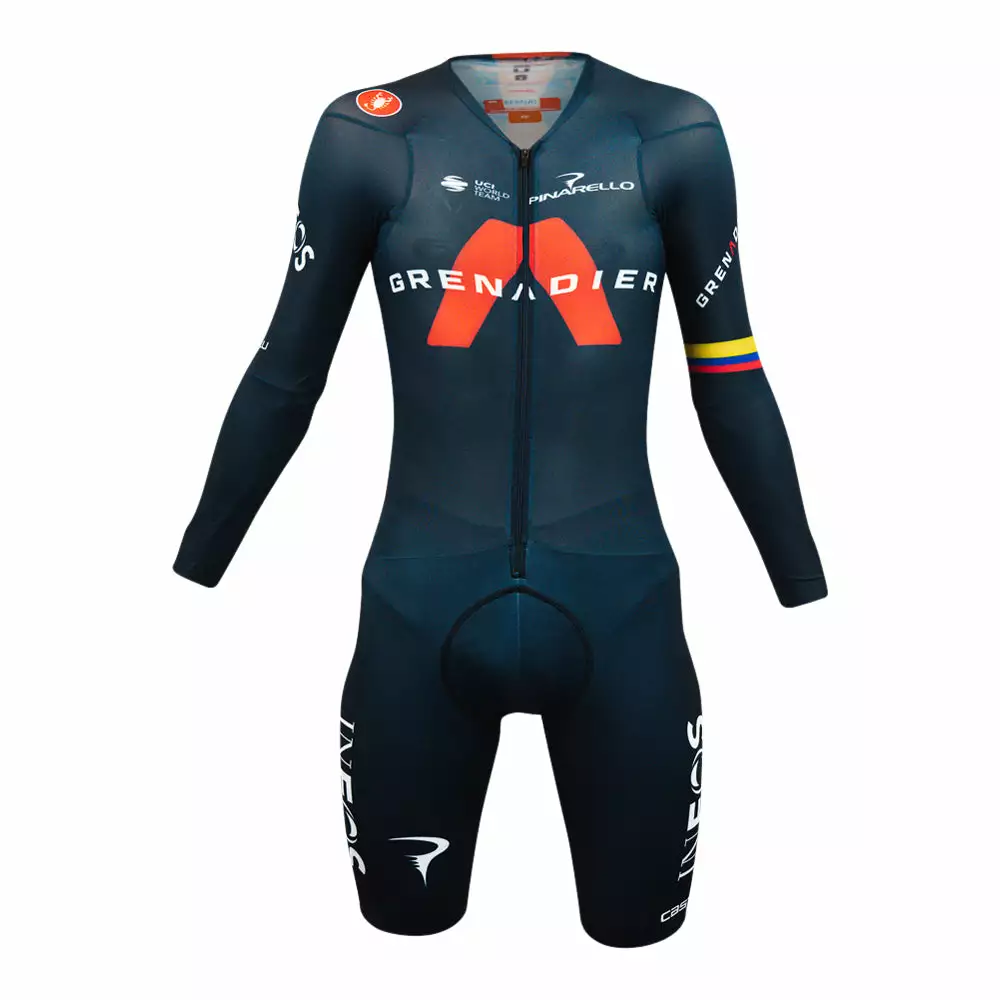 Castelli Body Paint 4.X LS Former Colombian ITT Champion E. Bernal Speed suit by Ineos Grenadiers is a triathlon suit that provides additional arm protection due to its long-sleeved design and shorts. The brand logo is printed on the bottom of these shorts that will make you stand out from the crowd.