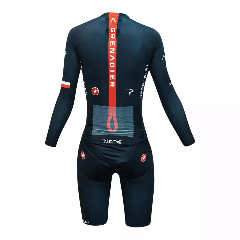 Castelli Body Paint 4.X LS Former Polish Champion M. Kwiatkowski Speed suit by Ineos Grenadiers is a triathlon suit that provides additional arm protection due to its long-sleeved design and shorts. The brand logo is printed on the bottom of these shorts that will make you stand out from the crowd.