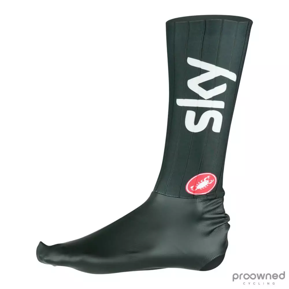 Brand new Castelli Fast Feet TT shoe covers from Team Sky* made for the 2019 season. The Castelli Fast Feet TT shoe covers the ‘Fast Feet’ project, a series of products designed to maximize aerodynamics during time-trials and all while keeping within the constraints of the UCI rules.