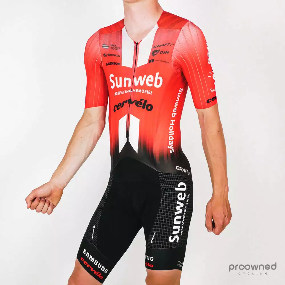 Short sleeve skinsuit from Craft made for the World Tour Team Sunweb* for the 2019 season. With a small oil stain on the back, but nothing that affects the suit.