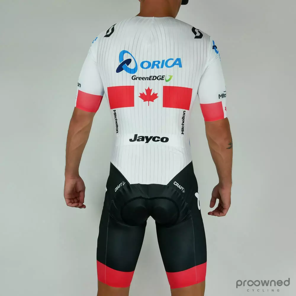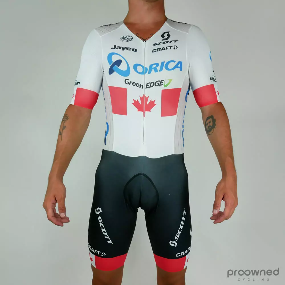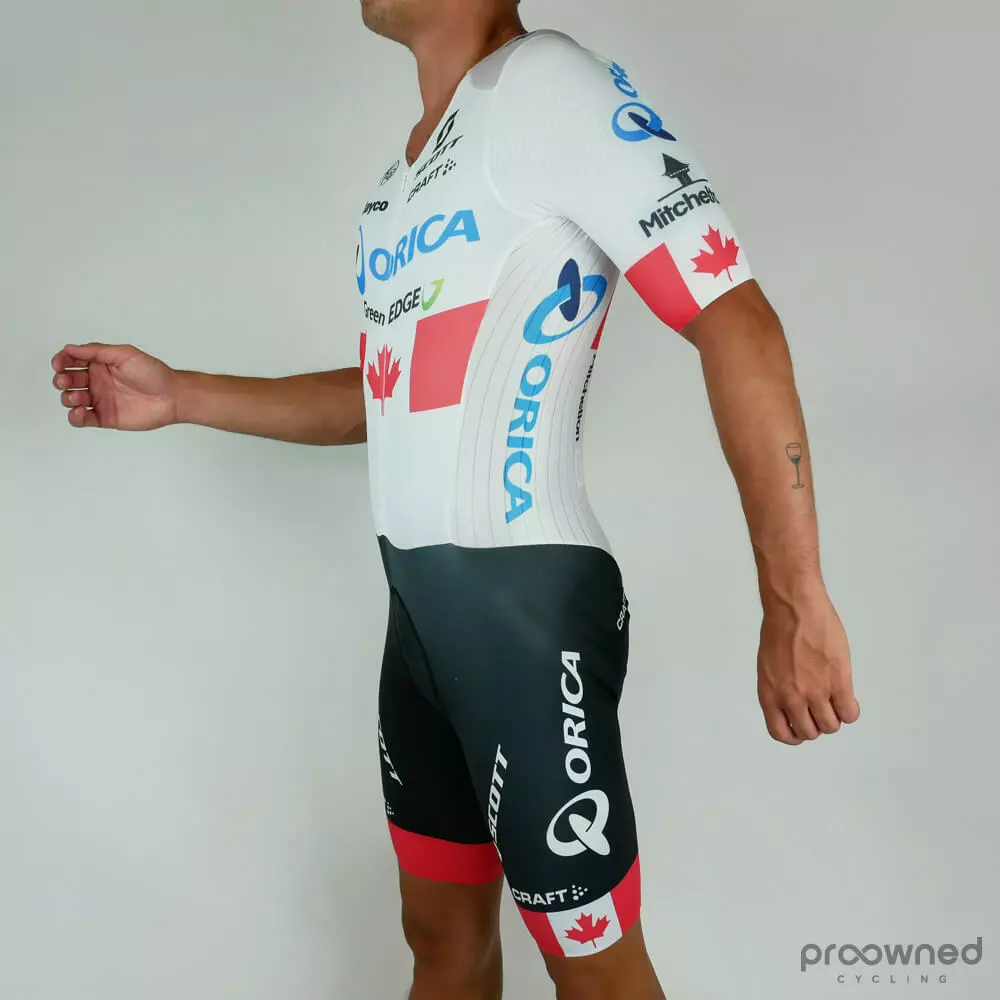 It is Crafts top model, which is custom made for the World Tour Team Orica-GreenEDGE. This means that this is a very high-quality skinsuit. The material is breathable, which ensures good comfort even when the body sweats.