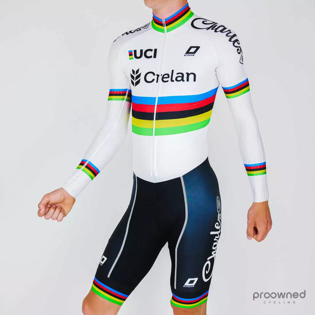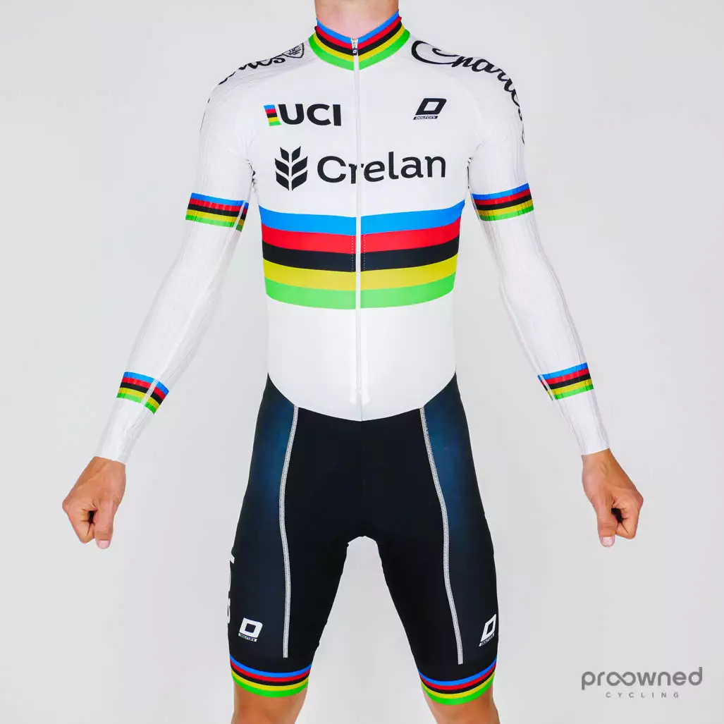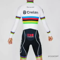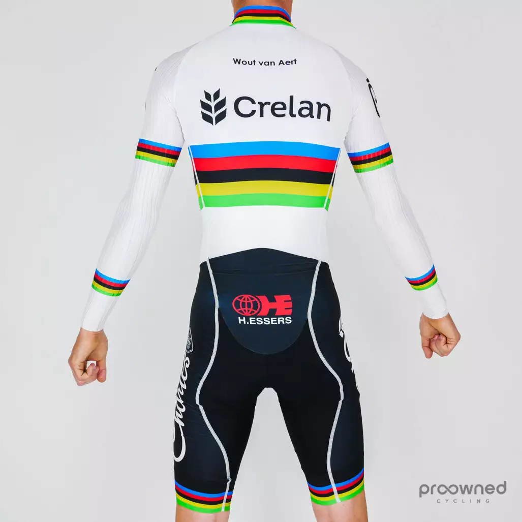The suit is specially made for World Champion Wout Van Aert and is styled with the original World Champion stripes. Wout Van Aert is written on the back. Made for the 2016 season.