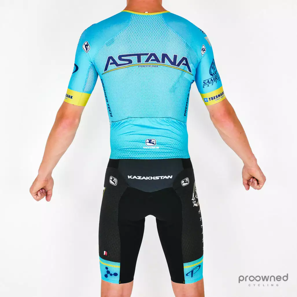The speed suit has been custom-made for the world-tour team Astana. The speed suit is based on Giordana’s Doppio speed suit but has been optimized for riding in hot conditions.