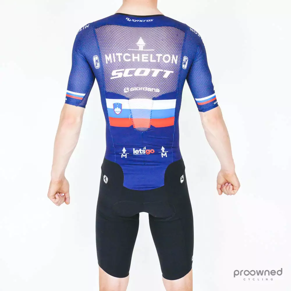 Designed as a super aerodynamic speedsuit specifically for team Mitchelton-Scott by Giordana. Ergonomically designed and with highly breathable fabrics that make the suit fit like a second skin. The back of the suit is made of a thin and breathable material perfect for summer racing. Build for speed with a tight racing fit.
