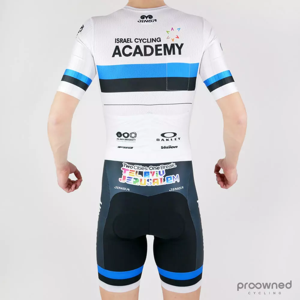 Brand new speed suit from Israel Cycling Academy* made for the 2019 season. Speed suits are made for the highest aerodynamic and best comfort – It combines the benefits of the aerodynamic skinsuit and the comfortable classic bib and jersey.