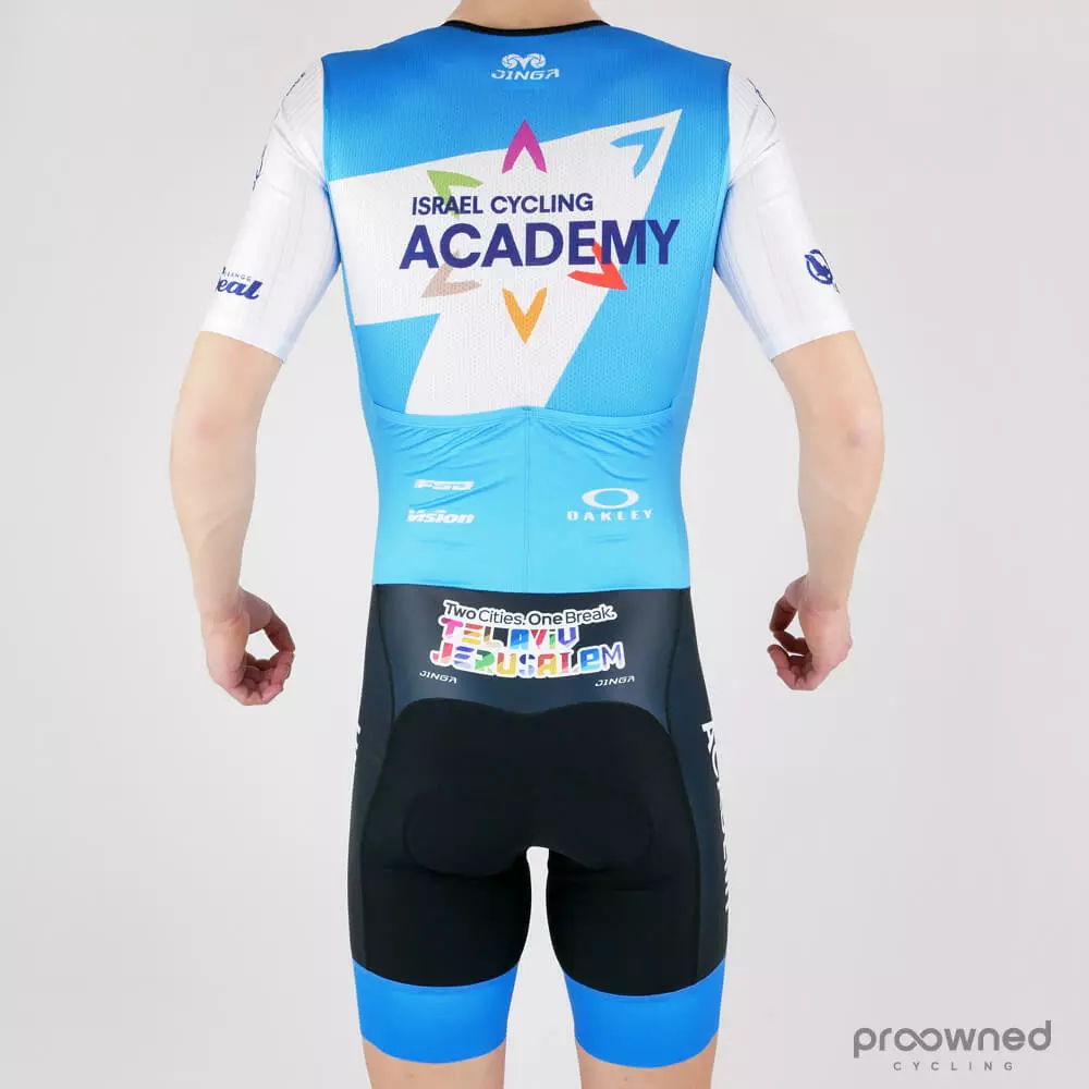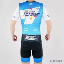 Brand new speed suit from Israel Cycling Academy* made for the 2019 season. Speed suits are made for the highest aerodynamic and best comfort – It combines the benefits of the aerodynamic skinsuit and the comfortable classic bib and jersey.