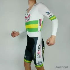 It is Santini’s top model, which is custom made for the Australian National Team. This means that this is a very high-quality skinsuit. The material is breathable, which ensures good comfort even when the body sweats.