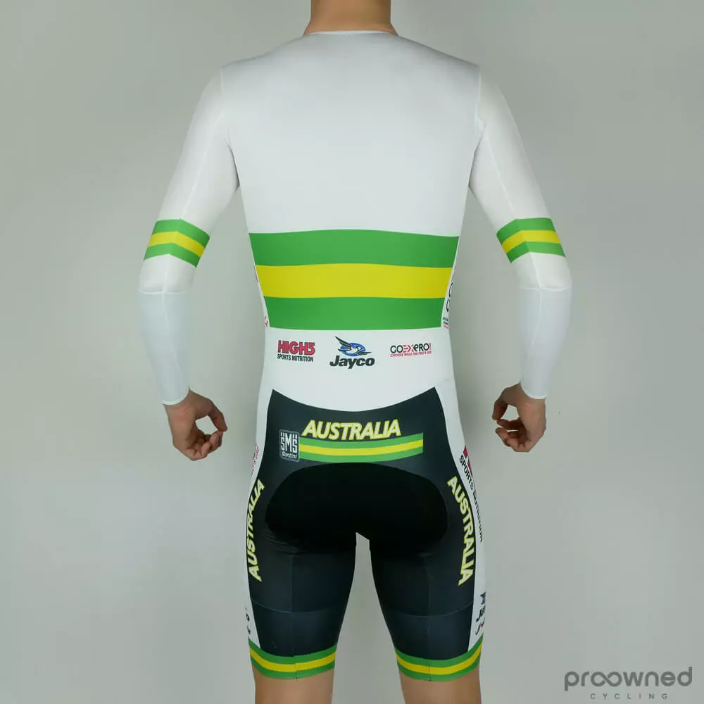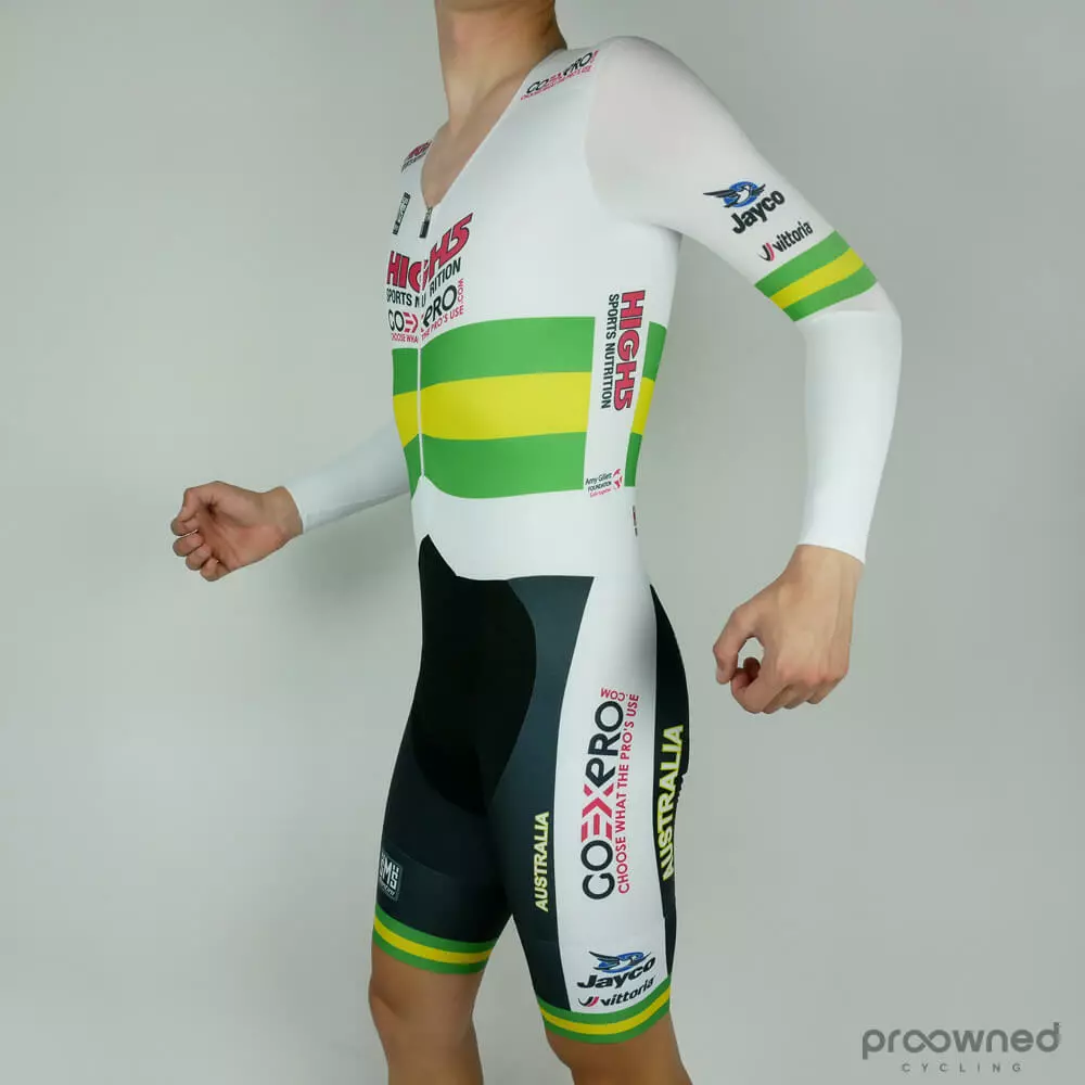 Brand new long sleeve skinsuit from Santini. This skinsuit with Santini’s C3 pad comes directly from the Australian National Team and is made for the 2016 season. The skinsuit fits tight and perfectly on the body, giving optimized aerodynamics. At the bottom of the legs and sleeves, there is an elastic silicone band, ensuring that the legs and sleeves are seated perfectly.