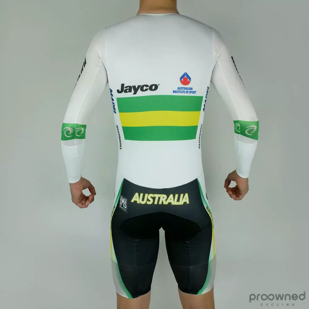 Brand new long sleeve skinsuit from Santini. This skinsuit with Techno Comfort pad comes directly from the Australian National Team and is made for the 2011 season. The skinsuit fits tight and perfectly on the body, giving optimized aerodynamics. At the bottom of the legs, there is an elastic silicone band, ensuring that the legs are seated perfectly.