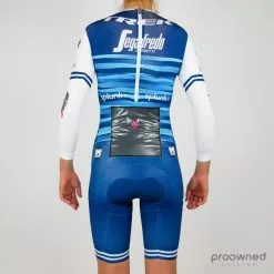 Brand new long sleeve skinsuit from Santini. This skinsuit with Santini’s C3W Women’s pad comes directly from the World Tour Team Trek-Segarfredo Women and is made for the 2019 season. The skinsuit fits tight and perfectly on the body, giving optimized aerodynamics. At the bottom of the legs and sleeves, there is an elastic silicone band, ensuring that the legs and sleeves are seated perfectly.