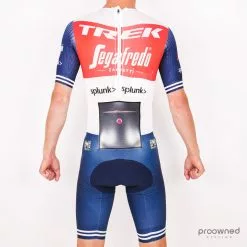 The Santini suit is specially designed for Trek-Segafredo to use in the race against the clock. Every part of the suit has been optimized for time trials. The fit is optimized for the time trial position, the fabric is aerodynamic, and on the outside of the crotch, the fabric is equipped with silicone to help you stay in the TT position.