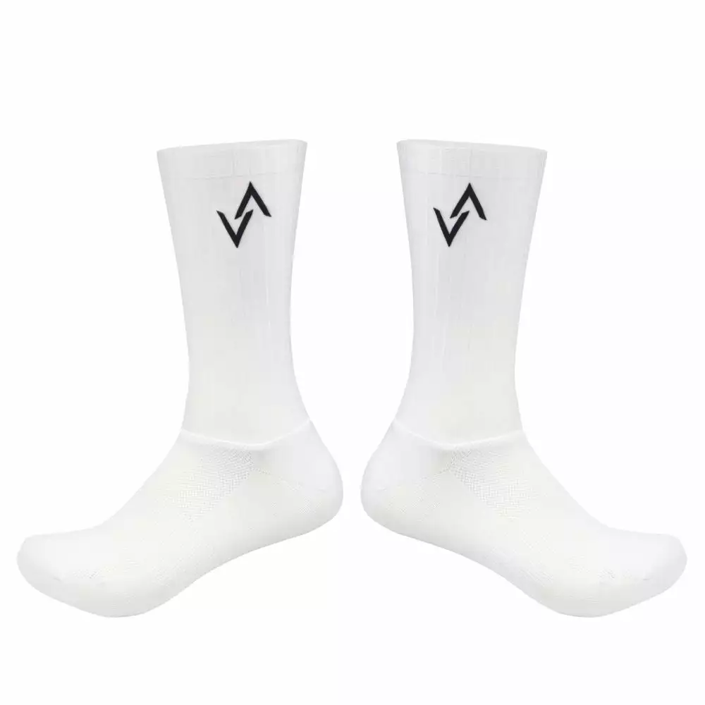 Sharp White Aero Socks are built to UCI-compliant length and provide an aerodynamic edge! The fabric combination of nylon and spandex allows air to remain on the leg for as long as feasible. The seam is hidden under the leg, where it will not interfere with airflow as it exits the legs.